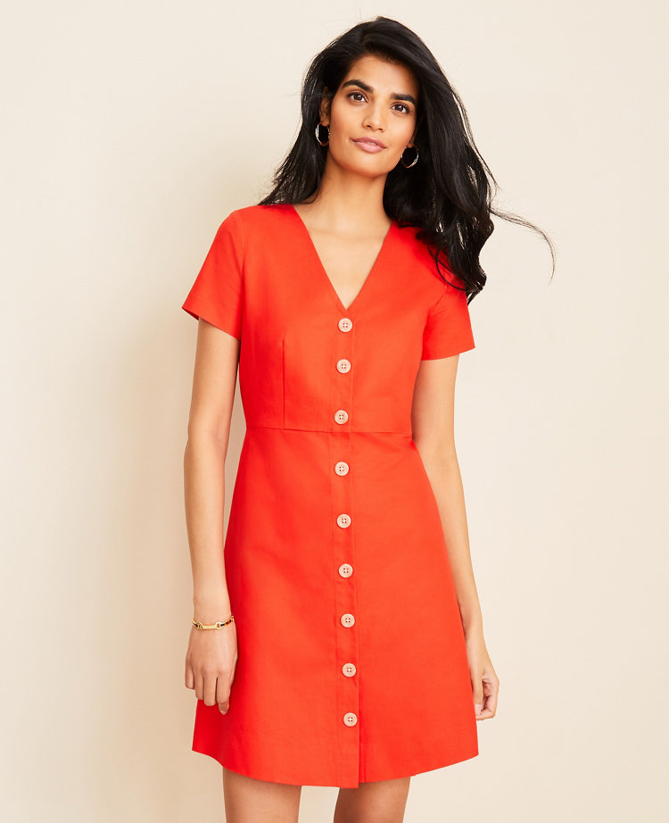 It comes to mid calf and both are available in petite and regular sizes. Both dresses are light and will be great for warm weather! If you’re digging the buttoned look on the front of my dress, check out the Ann Taylor Petite Cotton Linen Button Flare Dress in bright orange vermillion kiss. It is not gingham, but it’s a similar style with a v-neck front and short sleeve.