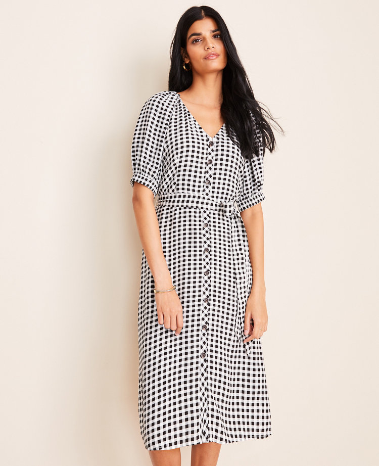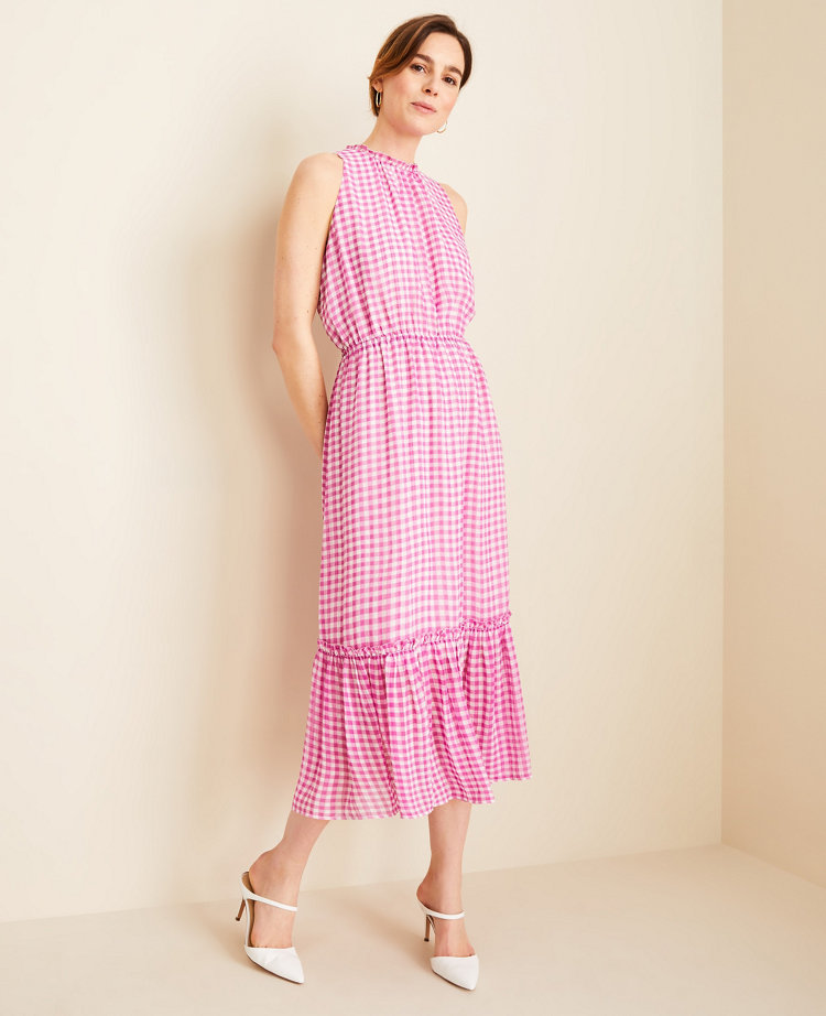 It has a subtle gingham pattern and the pleated front gives it a classic look. If you’re looking to be a bit more bold, they also carry the Ann Taylor Petite Gingham Midi Dress in bright purple verbena.
